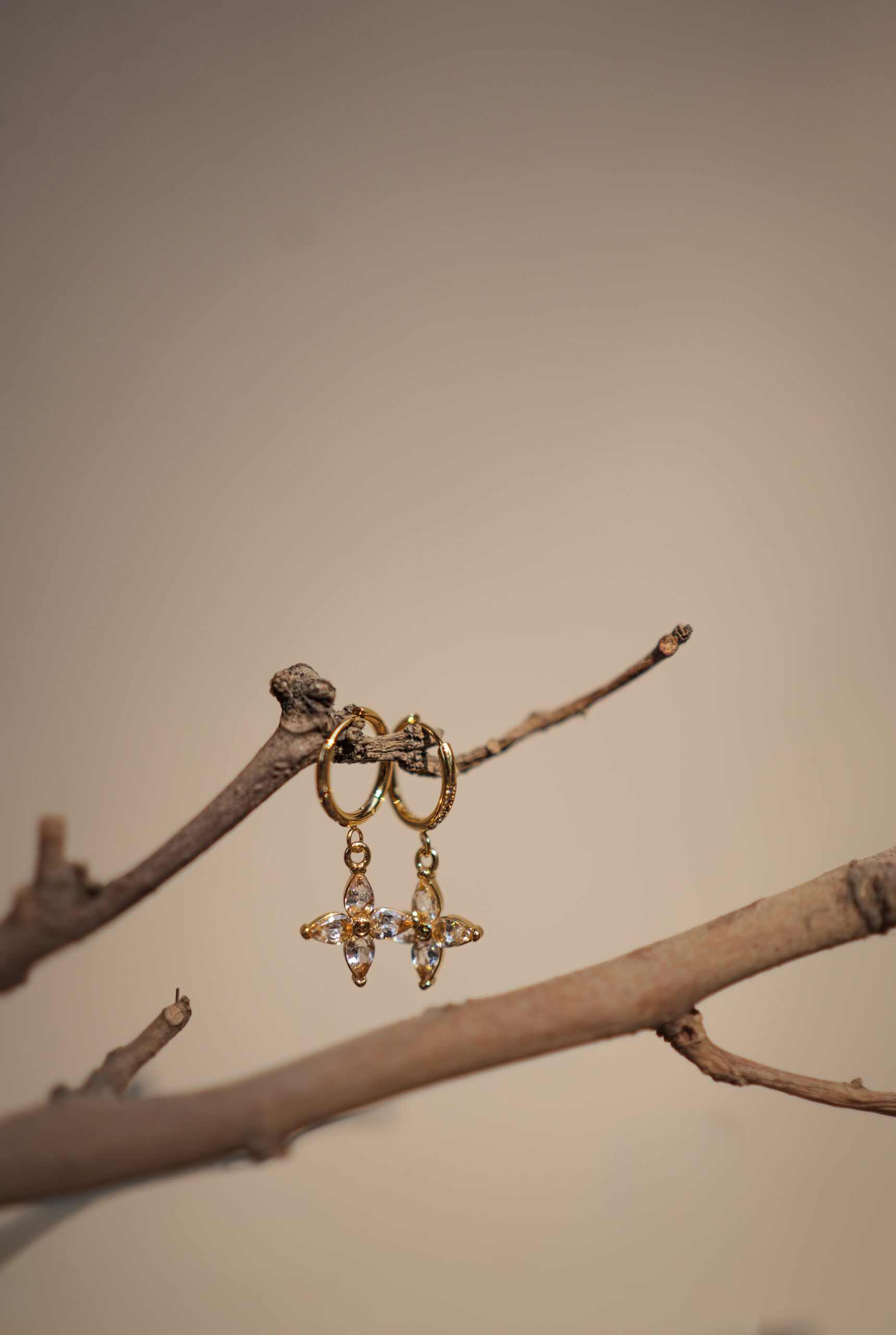Elegant and minimal, these anti-tarnish gold hoop earrings with crystal flower charm are designed to add a delicate sparkle to your look. The sleek gold hoops are paired with a beautiful four-petal crystal flower pendant, giving them a graceful and feminine touch.