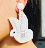 Grace meets artistry in the Celeste Dove Statement Earrings — a breathtaking symbol of peace, elegance, and refined craftsmanship. Hand-embroidered with delicate ivory beads, lustrous pearls, and subtle crystal accents, this dove-shaped design radiates soft sophistication.