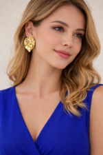 Make a statement with these stunning gold leaf stud earrings, inspired by the natural beauty of tropical foliage. Featuring a sculpted leaf design with intricate vein detailing, these earrings reflect light beautifully and add a touch of elegance to any outfit. Their bold yet timeless look makes them perfect for both everyday wear and special occasions.