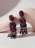 The bold, multicolour beaded earrings with effortless confidence. The rich black base and vibrant beadwork instantly draw attention, adding a playful yet elegant touch to her look. As she moves, the tiny dangling beads sway gently, catching the light and adding a hint of charm with every step.